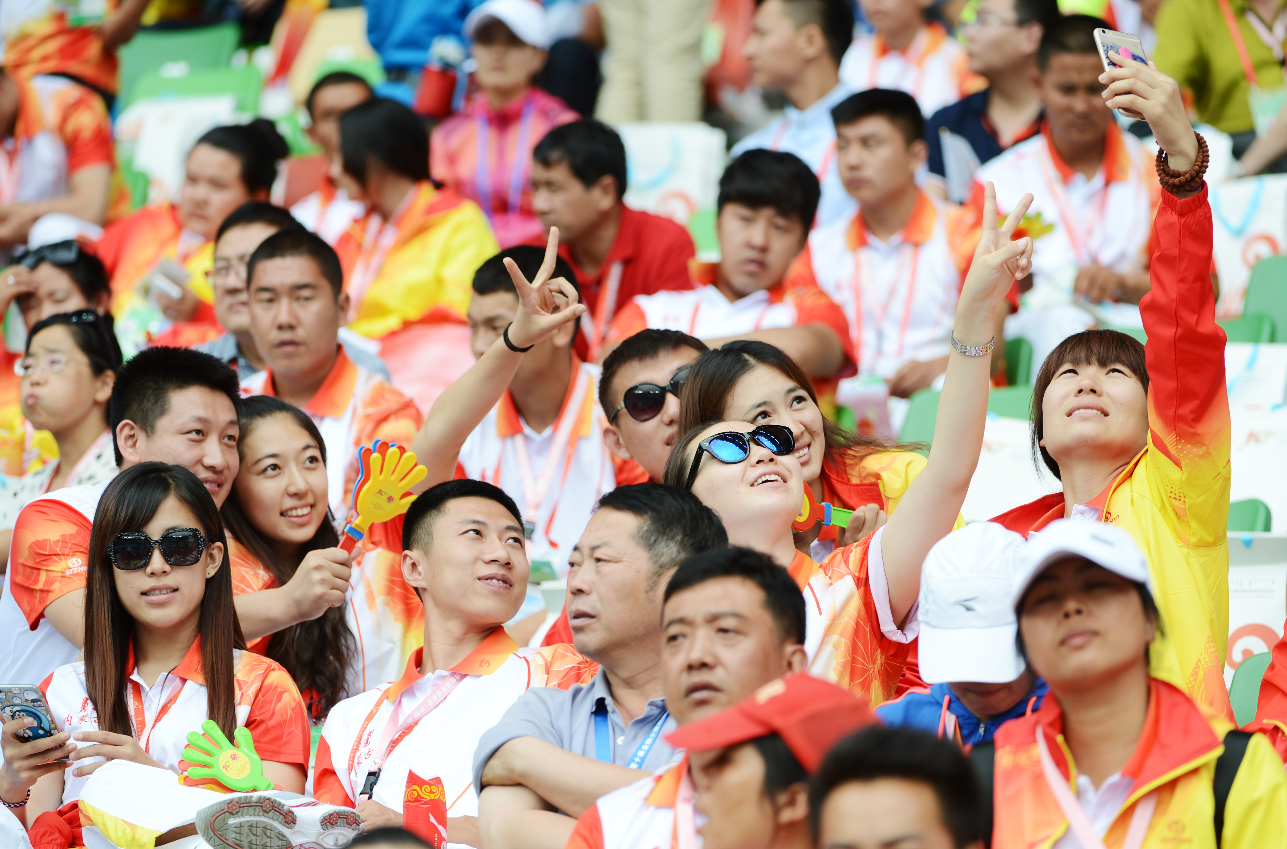 观众自拍为参与少数民族运动会留念。人民政协报记者 田福良\摄