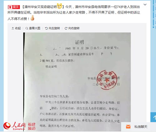 原标题:福建一派出所替老人向电信部门喊话:人还在,开什么“健在证”?