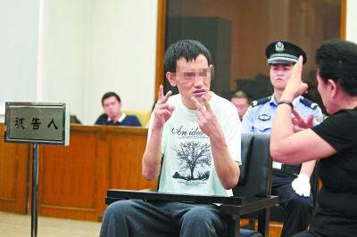 陈再进是一名聋哑人,智力发育水平也明显低于常人。法庭为他配备了一名手语翻译,坐定后,法官要求法警打开了他的戒具,让他能够通过手势回答问题。