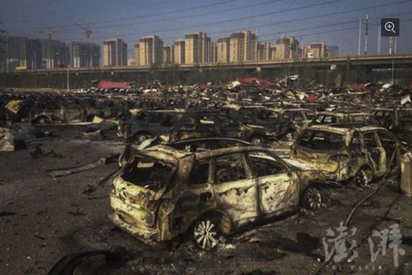天津爆炸现场近千辆全新汽车烧毁 钢铁发噼啪声