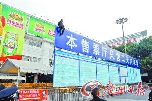 26日上午9时10分,广州车站派出所售票厅值勤民警黄警官接到旅客报警,称广州站售票厅门口的节前列车时刻表公告牌上有一名男子爬到高约七八余米的顶部准备跳下?;凭俳泳螅槐咄ㄖ富又行闹г?,一边与同事立即赶赴现场。在现场,该男子双腿骑坐在广告牌上,手舞足蹈,大声喊叫?;凭倭⒓炊云浜盎鞍哺凶忧樾鳎渌窬镁湎?,疏导群众迅速离开。谁知男子看到民警过来变得更加激动,嘴里一直嚷嚷着有黑社会的人要杀他,求放他一条生路等话。派出所指挥中心联系119和120支援。
