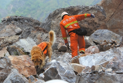 12日,救援人员带着搜救犬在事故现场搜寻被困人员。新华社发