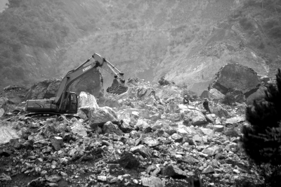 8月12日中午,记者赶到位于山阳县的事故现场。在群山环抱中的滑坡事故现场,一座巨大的山头几乎整体滑下后,在地面上形成了30余米高的滑坡体,两辆挖掘机正在碎石和土块交杂的滑坡体上谨慎地作业。经过负责救援的武警部队现场勘察,滑坡的体积在150万方至160万方之间。