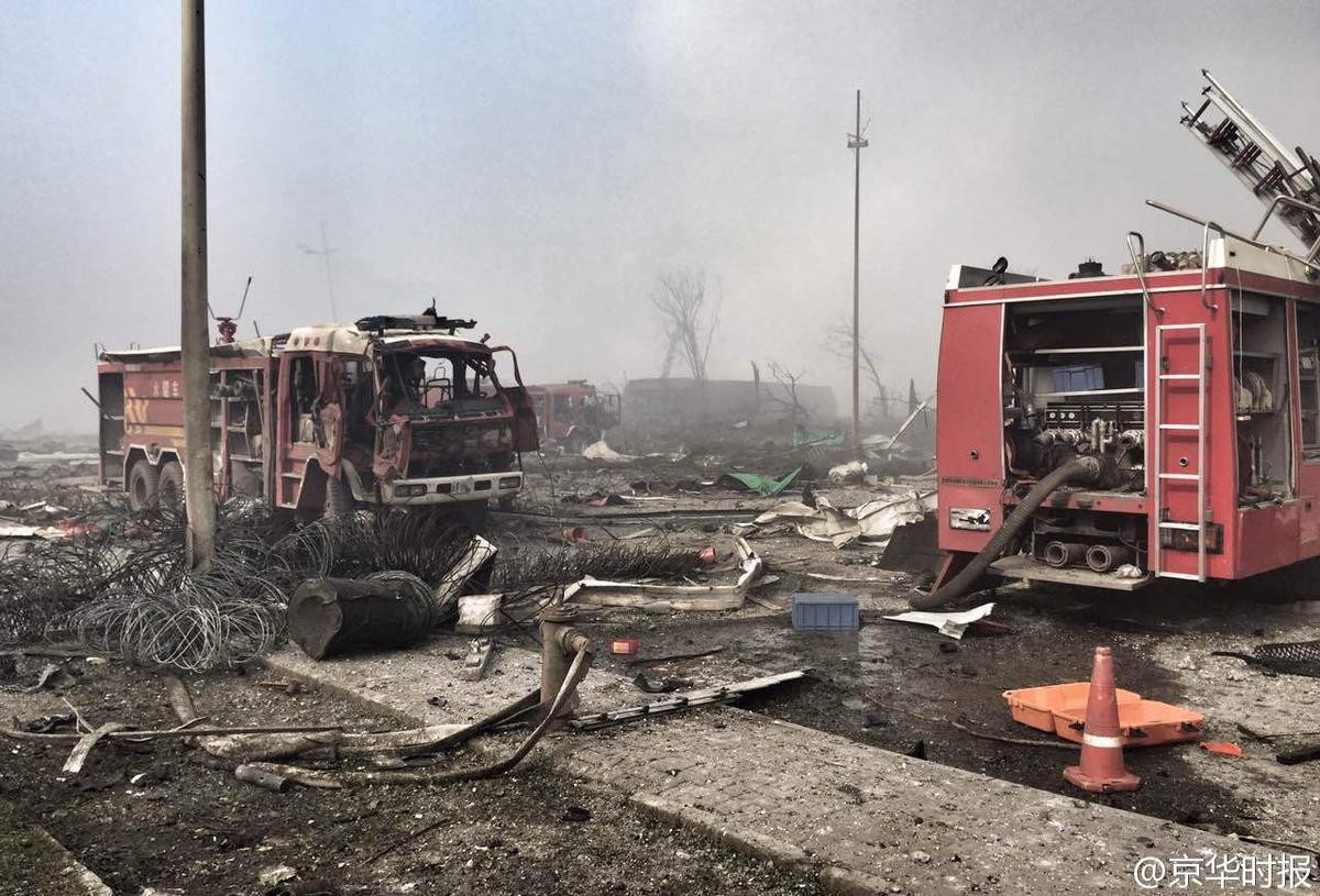 2015年8月13日,记者在天津爆炸火场东侧的跃进路上,发现五辆严重损毁的消防车,车内已无消防员,部分消防装备散落周围。京华时报 韩天博 潘之望/摄