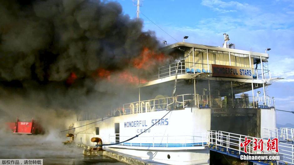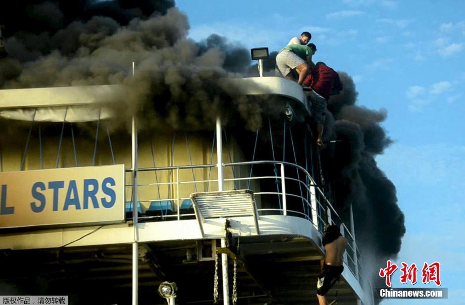 8月15日,在菲律宾中部的奥尔莫克,船员逃离失火的游轮。当日,一艘载有544名乘客的游轮从宿务抵达奥尔莫克的港口后不久起火,所有乘客安全撤离。