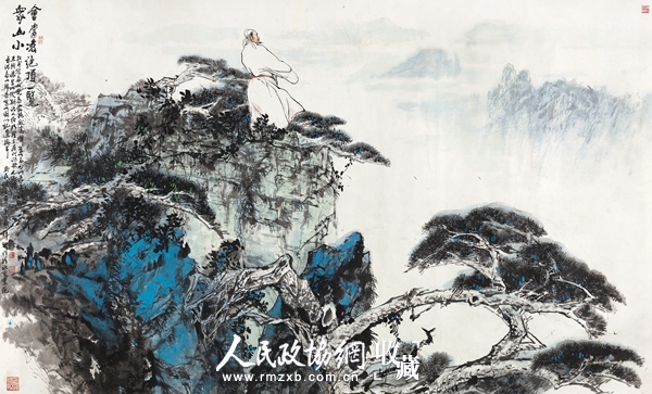 而当代书画部分不乏王明明、史国良、贾又福、石虎、范曾、徐乐乐等艺术家的作品。其中,王明明大尺幅作品《会当凌绝顶》创作于1983年,以杜甫诗意入画,画面构图独有气势,在迎客松矗立的苍岩绝顶高处,诗人独立天地间,观远处云山雾海,别有一番天地间舍我其谁的豪情。