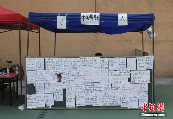 8月17日,天津滨海新区泰达第二小学安置点里的一块告示牌上,密密麻麻地张贴着寻人启事。 中新社发 刘关关 摄