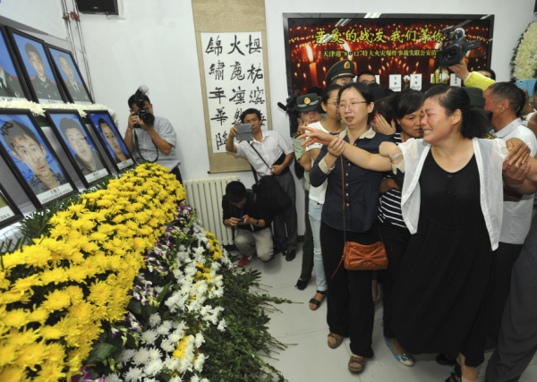 8月18日,事故中牺牲的消防战士亲属在天津市公安消防开发支队临时灵堂内悼念。