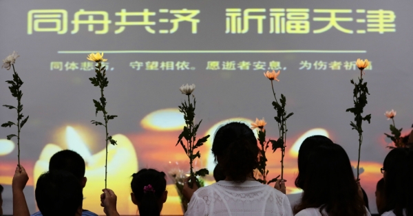 8月18日,天津市和平区南营门街的居民哀悼事故遇难者。
