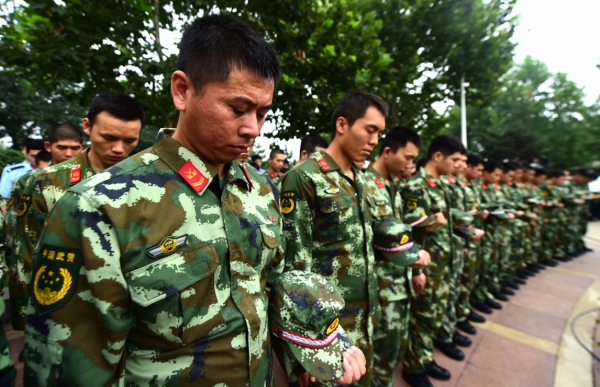 8月18日,武警官兵在天津市滨海新区京门大道街心公园举行的悼念活动上默哀。