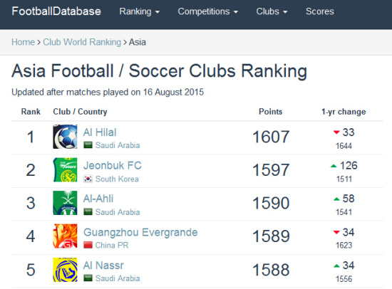 恒大位列亚洲第四。截图来自于足球数据统计网站footballdatabase。