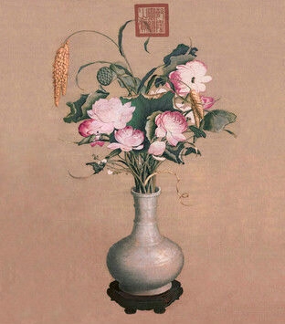 花卉、瓷瓶上都有光源反光的描绘,但是减缓了对比,显示出一种温和的西洋画风。郎世宁先后分别于雍正元年及三年画过二幅《聚瑞图》轴,可以看出,早期的一幅上郎世宁虽用得是中国画的颜料、技法,但却强调了造型的立体感及质感,尤其加入了西方绘画中所强调的光影变化,本质上,更接近于西方静物画。而后一幅则遵循中国传统工笔重彩花卉技法,淡化了光的明暗变化,以颜色的深浅来体现层次感和空间感。但在青瓷花瓶的描绘中,加入了高光来强调花瓶晶莹圆润的质感,是一幅中西结合的佳品。