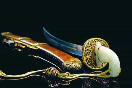 而那把威风凛凛的乾隆宝刀,做工考究,有和田白玉雕柄、金银铜丝镶嵌的云龙纹雕饰、镀金镂空装饰。清宫档案里查到这样的宝刀一共只做了90把,其他都收藏在北京故宫博物院,流传在外的仅此一把。