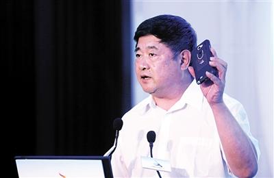 昨日,在2015文化创意产业(北京)研讨会上,故宫博物院院长单霁翔谈故宫文化资源的创意开发,展示自己的手机壳。新京报记者 薛珺 摄