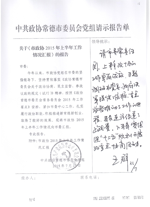 今年上半年,常德市政协在市委的坚强领导下,紧扣市委中心工作,牢牢把握新常德新创业总要求,认真组织议政建言活动、自觉服务改革发展稳定大局,继续实施重点事项监督、不断完善民主监督方式方法,着力完善提案工作机制、切实提高提案工作实效,深入开展服务基层月活动、努力促进政协工作接地气,扎实推进“三严三实”专题教育、全面加强干部队伍建设,各项工作取得了较好的效果。7月15日,市政协党组向市委呈报了《2015年上半年工作情况汇报》,7月31日,市委王群书记作出批示:“请市委常委传阅。上半年政协的工作卓有成效,专题调研为党委、政府决策提供了依据,重点监督推动了工作的进程,委员走访传递了正能量。下半年要围绕‘十三五’规划开展好重点协商活动。”