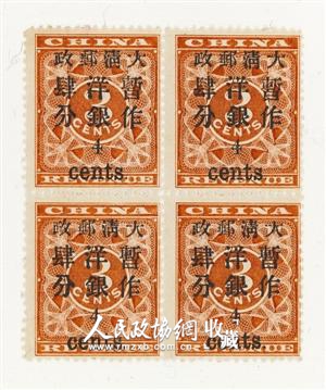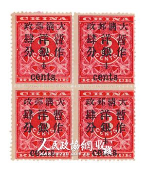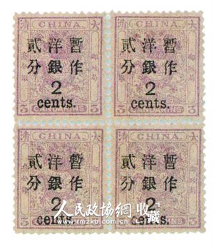 据了解,大龙、小龙邮票均属清代海关邮政邮票,由设在上海的海关总署造册处印制。海关邮政是大清邮政的前身,而不是国家正式邮政,只局限于通商口岸,不能满足当时社会通信的需要。1896年清政府开办了国家邮政,并改用银元为面值币制,以代替海关邮政时期的关平银,通称“洋银”。当年因正式邮票赶印不及,就在小龙邮票上加盖黑字暂作洋银面值来充当国家邮政邮票使用。这种邮票有加盖小字和大字两种,夏衍先生收藏的“小龙加盖小字”和“小龙加盖大字”各有1套四方连新票。小龙加盖大字邮票,当时加盖数量不多,目前国内流存极少。