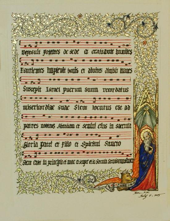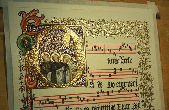 去年底完成的一幅O lumen Ecclesiae,是她自行设计的第一幅抄本,描绘了三位道明会修士歌唱圣咏的场景,装饰和细节都是她在翻阅大量资料后设计布局的。如今这幅作品被委托转赠给美国加州奥克兰道明会的阿尔伯特修道院,为后者收藏,这也是缈沨最有成就感的一件事。“画手抄可以让人静如止水地阶段性完成该做的事情,就和抄经一样,是件修心的事。”缈沨说。