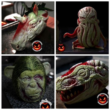 比如你能想象有人把西瓜雕刻成独角兽、猿猴、蜥蜴及怪物的样子吗?配上西瓜原本鲜红的果肉,乍看上去还真会让人有点恐惧。