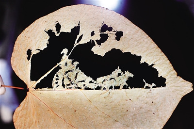 “选树叶时,最好的就是刚落到地上的,或是树上摇摇欲坠的。这种形状一般会相对完好,经过晾晒保留一定水分,又不完全干枯变脆,适合雕刻。”刘老向重庆晚报记者介绍,在雕刻之前,他会先设想好这片树叶的主题,在树叶上勾勒要下刀之处。