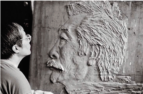 那天赵二湖打来电话说,他爸100岁纪念活动,需要我做一个小浮雕像,就跟“老舍”那样做就行。我爱做,马上动手,一会儿就完成了,我挺高兴,特别是那嘴,我觉得都做活了。二湖在山西,我把小像翻成石膏,到邮电局好好包装快递过去,就等着他镀出的效果了。