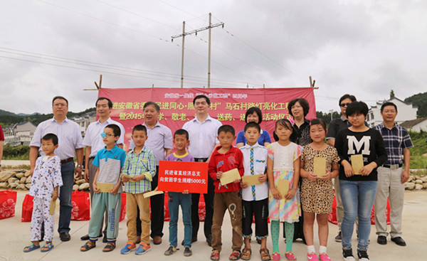 活动仪式上,李和平代表民进安徽省委会致辞,并将代表民进安徽省委会捐助建设的30杆路灯模型交到马石村负责人手中。民进省直经济总支现场向贫困学生捐赠助学金5000元,安徽民进企业家会员联谊会为马石村的贫困老人送来了10000元的慰问品。仪式上还向贫困老人们发放了由民进书画家书写的“福”、“禄”、“寿”大红斗方10幅。仪式结束后,来自安徽中医药大学中西医结合医院和合肥市第二人民医院的医疗专家们为村民提供义诊咨询服务,宣传健康知识,赠送常用药品,受到群众们的热烈欢迎。
