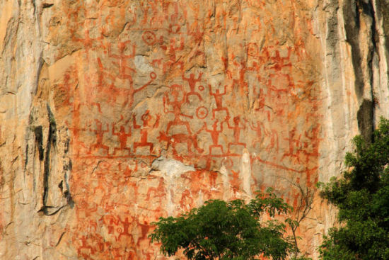 记者在宁明县城中镇耀达村明江西岸的花山崖壁下看到,画面约从山脚2米开始绘制,以5至20米高的中间部分的画像最多;岩画以人像构成主体,人像一般作正面、侧身两种姿势,多为举手屈膝的半蹲姿势,辅以马、狗、铜鼓、刀、剑、钟、船、道路、太阳等图像。专家介绍,其历经数千年风雨侵蚀依然清晰可见,在广西乃至世界上都极为罕见。