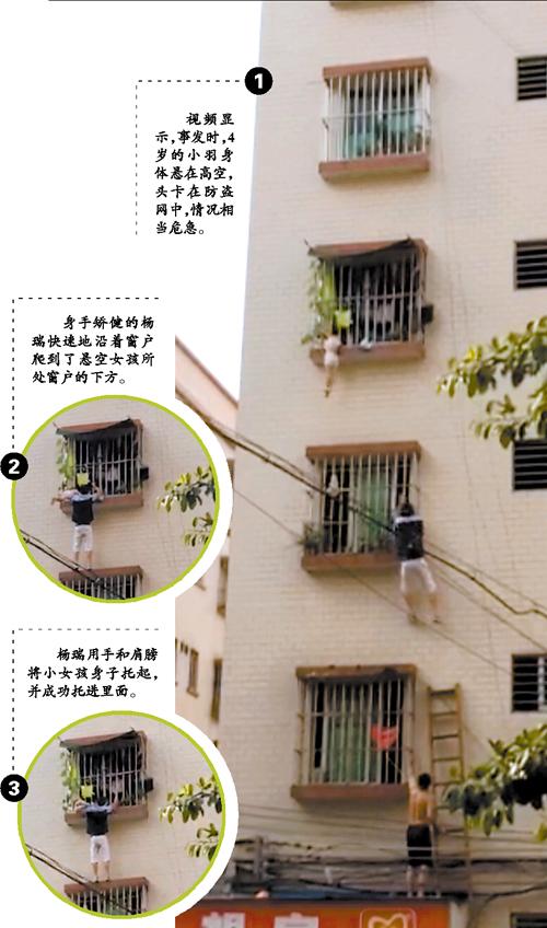 救人:爬三层窗,用手和肩托起小女孩