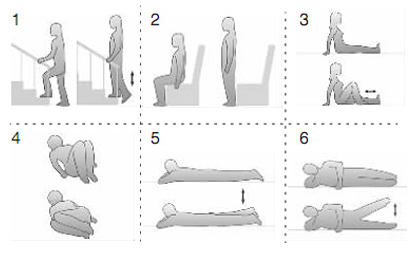 2.起立坐下。选择一把没扶手的硬椅子,坐直身体,双臂自然下垂,保持身体平衡。之后,控制身体,缓慢起身站直。反复10次。注意:起立坐下时,双脚原地不动。