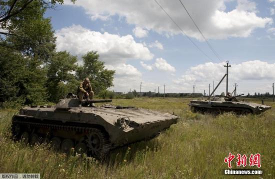 图为当地时间7月21日,顿涅茨克的杰巴利采沃郊区,乌克兰民间武装的装甲车从前线撤离。