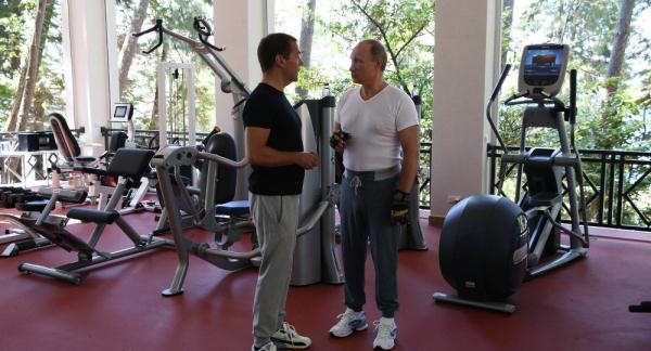 人民网8月31日讯 据BBC报道,30日,在位于索契的政府官邸内,俄国总统普京和总理梅德韦杰夫一起前往健身房锻炼。