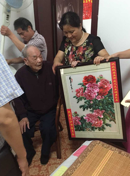 在抗战老兵孙志明家中,副主委李丽雄代表市委会向93岁的老兵表达了慰问和敬意,了解日常起居情况。值此全国上下掀起纪念抗战胜利高潮之际,市委会向老兵献上精美湘绣一幅,感谢老兵为抗战做出的重大贡献和为广大民建人做出了先锋表率。老兵心情激动,打着拍子与大家一起唱起抗战歌曲:“风在吼,马在叫,黄河在咆哮……”