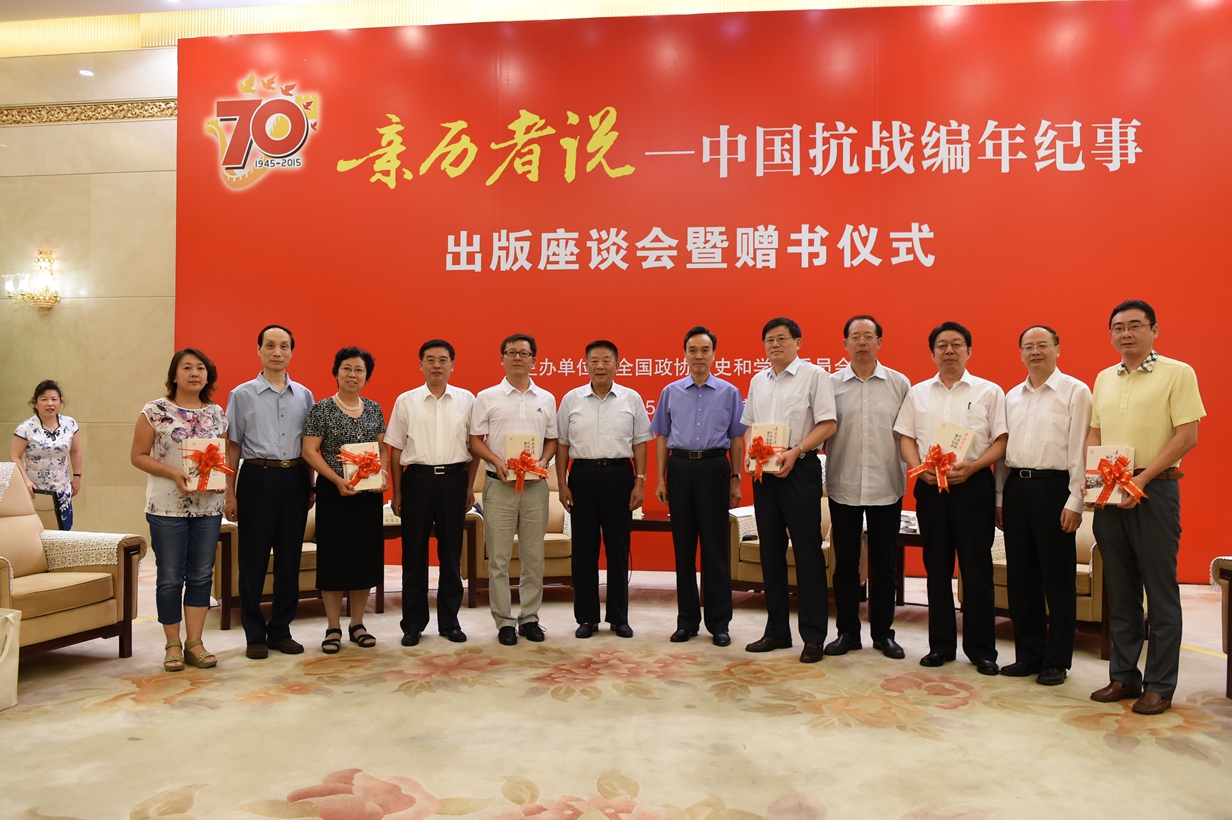 人民政协网北京8月31日电 2015年8月31日下午,由全国政协文史和学习委员会主编、人民出版社出版的《亲历者说—中国抗战编年纪事》图书出版座谈会暨赠书仪式在全国政协礼堂举行。会议由全国政协文史和学习委员会主办,全国政协办公厅、文史和学习委员会有关领导、部分全国政协委员和中共中央党史研究室、国家新闻出版广电总局、民革中央、中国社会科学院近代史研究所、国家图书馆、北京市政协、中国人民抗日战争纪念馆等有关单位负责同志,部分抗日老战士、抗战将领后人代表等约50人参加座谈会。