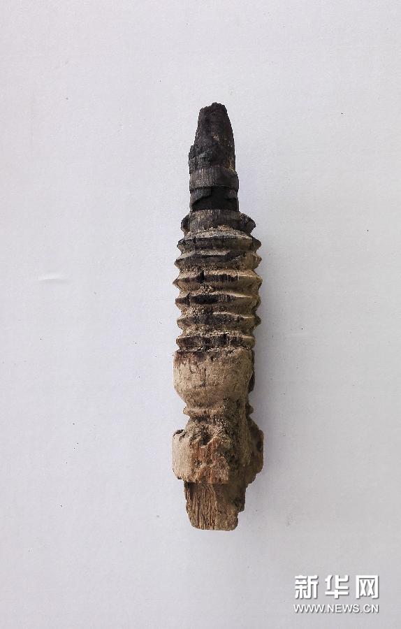 (4)这是发掘现场出土的木雕塔刹(8月30日摄)。