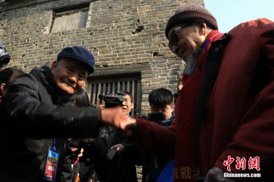 4月8日上午10时,台儿庄大战胜利77周年祭奠英烈仪式在山东枣庄台儿庄举行,苍凉悲壮的声音在古运河畔回荡。战争亲历者、参战将士亲属代表、日本友好人士、史学研究专家、社会各界人士共近千人前往台儿庄大战纪念馆、台儿庄大战无名烈士墓,为长眠在此的英烈献花,缅怀民族英雄。图为101岁的台儿庄大战老兵代表邵经斗和102岁台儿庄大战战地记者蒋思豫77年后在台儿庄大战遗址相见。梁犇 摄