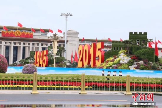 9月1日,天安门广场上红旗飘飘迎接阅兵日。9月1日至9月5日,北京天安门广场周边高大建筑物将全部插挂彩旗,全市各街道、社区、单位等将悬挂国旗,以庆祝中国人民抗日战争暨世界反法西斯战争胜利70周年。中新社发 王徐 摄