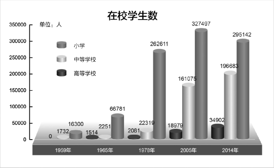 教育事业日新月异,实现学有所教。全区所有县(区)全面完成普及九年义务教育,一个涵盖学前教育、基础教育、职业教育、高等教育、成人教育、特殊教育的比较完整的现代教育体系已经形成。实现了从学前到高中阶段15年免费教育,农牧区义务教育学生营养改善计划全面落实,政策和资金覆盖率均达到100%。“三包”(包吃、包住、包学习费用)政策覆盖学前教育到高中阶段所有农牧民子女和城镇困难家庭子女,且不断提高标准,年生均标准已提高到3000元。全面启动实施城镇三年、农牧区两年学前双语教育工程。2014年底,幼儿园在园幼儿达8万多人,学前教育毛入园率达60%。2014年底,全区拥有普通高等院校6所;中等职业学校9所,在校生1.7万人;高级中学22所,完全中学4所,初级中学93所,十二年和九年一贯制学校各3所,小学829所。小学适龄儿童入学率达到99.64%,青壮年文盲率下降至0.57%以内,人均受教育年限达到8.6年,新增劳动力受教育年限达到12年以上。1984年,中央政府作出“在内地为西藏办学培养人才”的重大战略决策,现有21个省市办有西藏班(校),已累计为西藏培养了大中专毕业生3.2万余人。目前西藏不仅有了自己培养的硕士、博士,而且有了一批享誉全国的专家、学者,逐步建立了近30个科研院所,有各类专业技术人员69709人,学科领域涉及历史、经济、人口、语言、宗教和农业、畜牧、林业、生态、生物、藏医药、盐湖、地热、太阳能等数十个门类。其中,藏学、高原生态、藏医药等学科研究在全国处于领先水平,产生了一批有世界影响的学术成果。