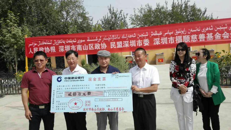 人民政协报副总编辑张宝川、深圳市南山区政协主席陈章联、新疆自治区政协秘书长刘振强以及部分民盟深圳市委成员、深圳南山区政协委员,深圳福顺慈善基金会有关负责人,巴楚县政府、政协领导和部分村民代表出席了捐赠仪式。