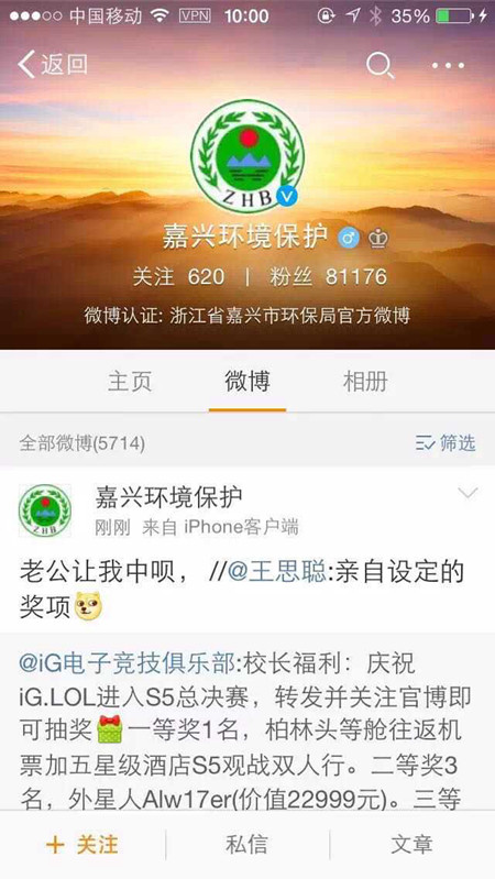 “老公让我中呗。”今天上午,嘉兴市环保局官方微博“嘉兴环境?;?rdquo;转发了被奉为“国民老公”王思聪的一条微博,并配上了如此令人咋舌的评论,一时间被网友议论。