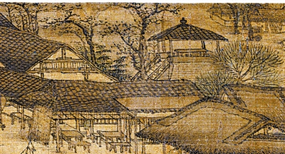 图中的城郊绘有一砖台,南宋孟元老《东京梦华录》里对此有所记述:东京“又于高处砖砌望火楼,楼上有人卓望”。这是一座建在外城的望火楼,按当时规定:“下有官屋数间,驻屯军兵五百余人,及有救火家事……则有马军奔报,军厢主、马步军、殿前三街、汴京府各领军级扑灭,不劳百姓。”这支专业的灭火队伍,被称之为“潜火兵”,他们驻扎在望火楼下,实行军事化管理。遗憾的是,画中的望火楼已摆上供休闲用的桌凳,楼上无一人守望,更不用说准备传报火警的快马,望火楼下两排兵营式的平房已被改作饭馆,北宋末的消防系统已颓败至此。