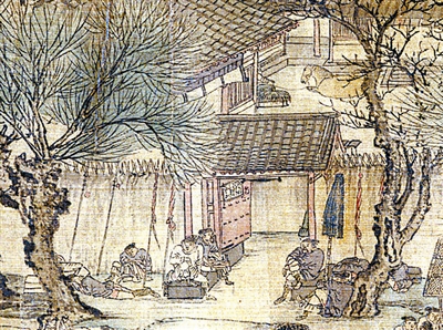 画家在城门外画有高等级的驿站,一座木桥与院门相连,门前坐卧着9个兵卒,还有两只公文箱,显然这是一队公差,像是在这里待命多时,已十分疲惫了。院子里躺卧着一匹吃饱的白马,一个马夫手持缰绳,斜倚一侧,似乎在等待马的主人。应在清早出行的差役队伍,快到晌午,差官还迟迟不出,真实地表现了徽宗朝拖沓低效的吏治局面。