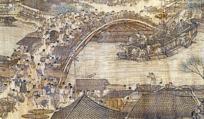 画中街道两边大量出现屋檐前加建的雨搭以及从平房伸展出来的遮阳棚和挡雨棚等辅助性建筑,或开设买卖,或摆摊设担,经过数次“得寸进尺”,构成了北宋几朝都无法解决的“侵街”现象,造成交通拥挤、消防通道堵塞的痼疾,且愈演愈烈。商铺甚至云集到桥面上,堵塞桥面通行,造成险象环生的局面。城门口亦拥堵不堪,无人管理,这些都是城市管理失控造成的。(图见看点三)
