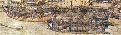 画中绘有十一条专事运输粮食的漕船,欣赏者都会被其严谨的绘画技艺与真实的生活气息所感染,而忽略在它们的背后深藏着严重的社会?;1彼纬跄?,太祖限价售粮,太宗控制了南方后,更是力图通过漕运和仓储来掌控粮价。为了抵御荒年和逼退商贾的势力,北宋历朝均注重在汴河沿岸营建官仓?;谢嬗辛酱ψ靶豆ば洞某【埃髅侵富幼殴凸ざ游樾读?,粮食被装卸工转运到深巷的私仓里。要注意到:画中所有的粮船没有一条是官船,也没有一个督粮官到场监运,这意味着朝政丢失了国粮储运的机会,画家真实地再现了当时的景况,诉诸了潜在的官粮危机。