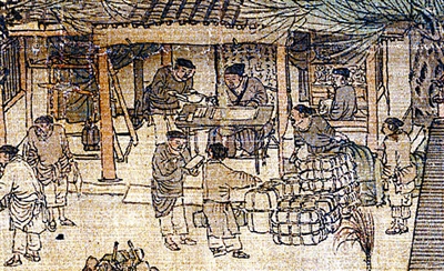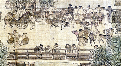 城门内头一家是税务所,门口有四个车夫运来一批装着纺织品的麻包,一个车夫进屋向税务官报税,税务官欲出具文字,门外的税务官指着麻包说出了一个官家想要的数字,一定是因高出来的税额,引起车夫们的不满,一个车夫向他递交了一份货单,进行解释,另一个车夫急得大声嚷了起来,吵声之高,惊动了城楼上的更夫向下张望。在徽宗朝大办漕运花石纲之时,税额激增,车夫与纳税者的纠纷,象征着当时紧张的官民关系,这完全是北宋的冗税制度激发了官民之间的对立情绪。