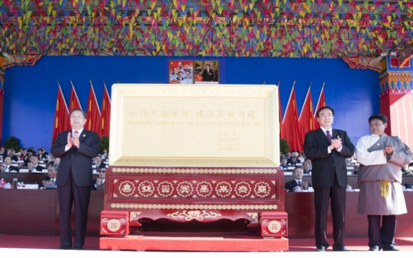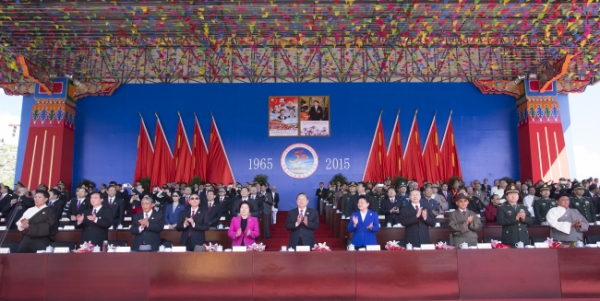 9月8日,西藏各族各界干部群众约2万人欢聚拉萨市布达拉宫广场,热烈庆祝西藏自治区成立50周年。中共中央总书记、国家主席、中央军委主席习近平在贺匾上题词“加强民族团结 建设美丽西藏”。中共中央政治局常委、全国政协主席、中央代表团团长俞正声出席庆祝大会并讲话。新华社记者黄敬文摄