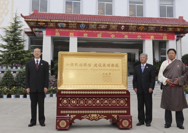 这是9月10日,杜青林向林芝市赠送习近平总书记题词“加强民族团结 建设美丽西藏”贺匾。新华社记者丁林摄
