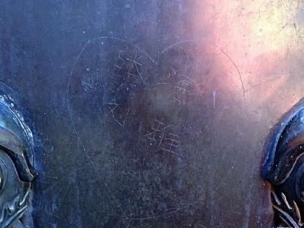 图片说明:铜缸右侧的两个铜环把手之间,刻着一个“爱心桃”,“爱心桃”内上下分别刻着“张涛”、“刘雅”两个名字。 来自网络