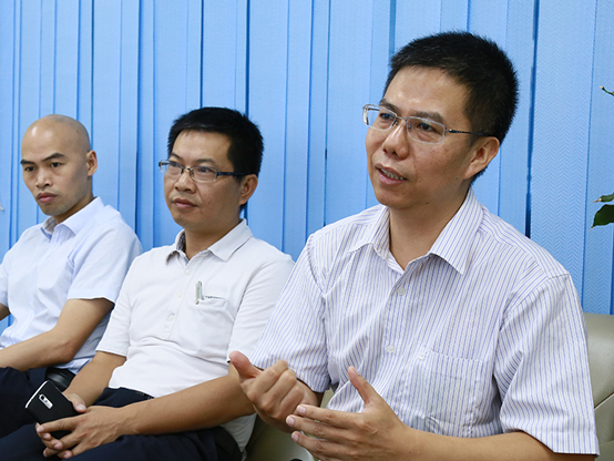 小榄镇卫计局公卫中心副主任黄松林(右)、小榄镇卫计局卫监所副所长梁雪军(中)、小榄镇卫计局防保社区队副队长邓必森(左)在接受新华网采访。新华网 杨锘 摄