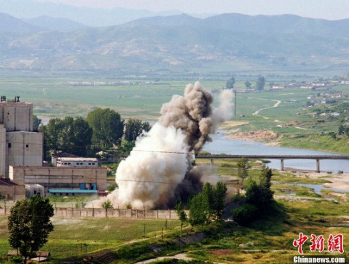 2008年6月27日,朝鲜宁边,朝鲜炸毁宁边核设施冷却塔。 图片来源:东方IC