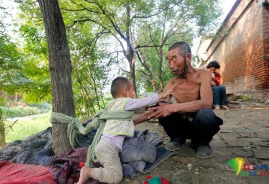 王孟义还告诉工作人员说,他目前所担心的是他的儿子小庆太,毕竟自己已经70岁了,憨媳妇又没有生活自理能力,他平时出去干活或者做饭的时候,就得把小庆太拴到木桩上去,以免他到处乱跑磕着碰着,他还担心自己百年之后儿子无人照顾,他希望能有人收养小庆太,给他一个好的生活环境。
