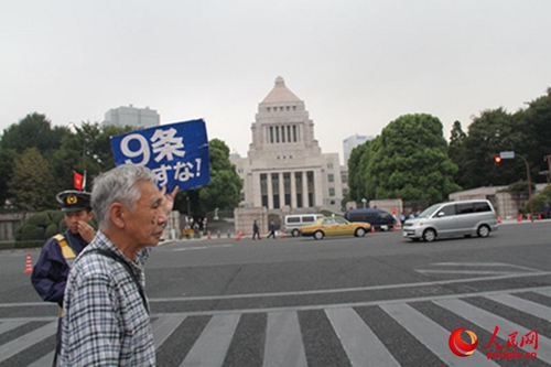 18日下午,一名抗议安保法案的老人走过日本国会议事堂前